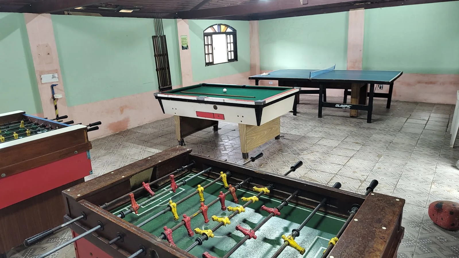 Salão de jogos com bilhar, ping-pong e pebolim.